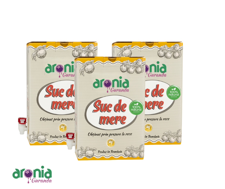Pachet economic de 3 × 3L Suc de Mere Aronia Guranda, 100% natural, presat delicat, fără zahăr și fără aditivi. Ideal pentru consum zilnic și întreaga familie.